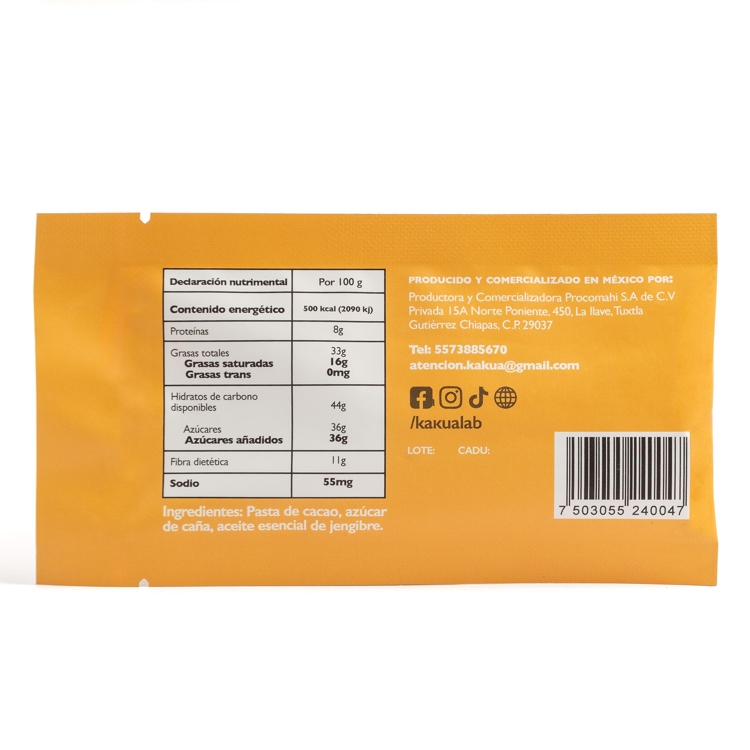 Paquete con 3 barras 60% cacao, 40% azúcar con extracto esencial de jengibre.